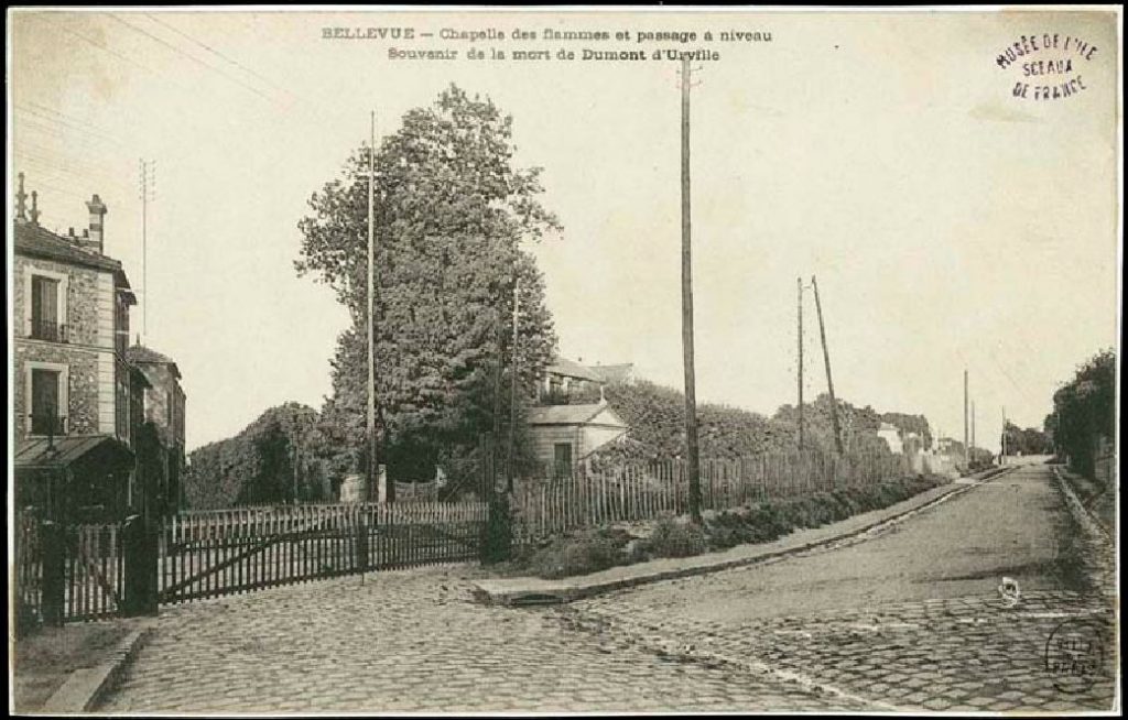 (Reproduction d’un tableau offert par l’auteur, M. Henry, de Bellevue. Ce tableau était suspendu dans la petite Chapelle de Notre Dame des Flammes élevée par M. Lamarie , architecte de Paris qui avait pu s’échapper d’un des wagons embrasés. La petite chapelle votive, bénite par Monseigneur Blanchard, évêque de Versailles, le 19 novembre 1842, est confiée aux » Frères de la miséricorde. Quatre messes y étaient célébrées tous les ans. Aujourd’hui la Chapelle n’est plus et le tableau à disparu.)